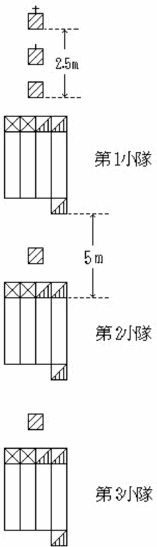 (3) 距離 同一線上に並んだ単位間の間げきをいう。この場合、隊員間の距離は、前の者のかかとまで測り、徒歩訓練における隊員間の距離は、おおむね1.2メートルとし、車両の距離は、前方の車の後端から後方の車の前端までを測るものとする。