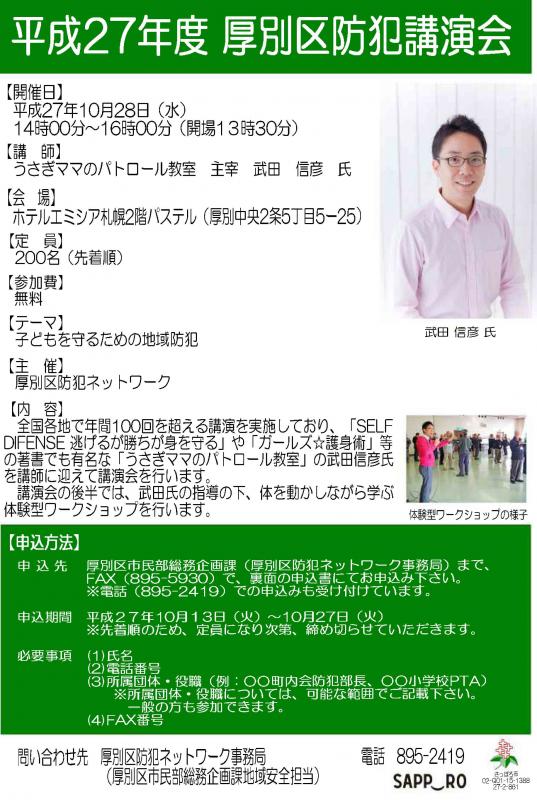 当防犯ネットワークは、参加する防犯関係団体の情報交換及び相互交流の場とし、「防犯団体の情報交換、防犯情報の共有」、「防犯に関する定期刊行物の発刊」、「厚別区ホームページへの防犯情報の掲載」、「防災講演会の開催等」を通じまして区民の皆さんの役に立つ防犯情報をお届けいたしたいと思います。