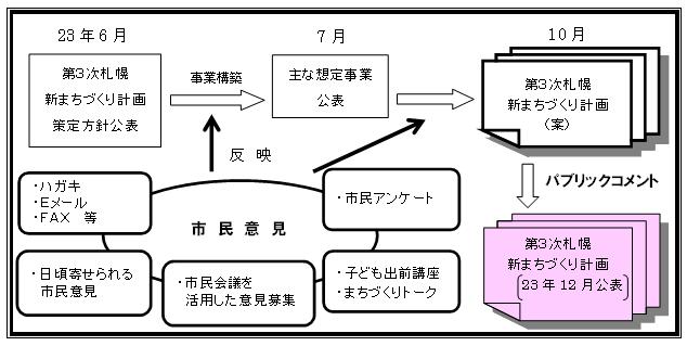札幌市自治基本条例の理念に則り、計画策定過程の各段階(策定方針公表、主な想定事業公表)において、その内容を市民の皆さんに公表し、パンフレットやインターネットなどで意見募集を実施したほか、市民アンケートや子どもを対象とした出前講座、まちづくりに関するシンポジウム(まちづくりトーク)の開催、市民会議(まちづくり戦略ビジョン)、パブリックコメントの実施など、積極的な市民意向の把握に努めました。把握した市民意向については、日頃寄せられる市民意見や要望と併せて、できる限り計画への反映に努めました。