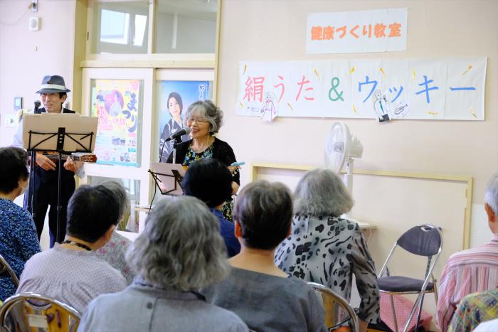 曙地区連合町内会福祉対策部が主催するの健康づくり教室が令和5年7月19日(水曜日)午後1時30分から曙まちづくりセンター仮事務所で開催、45名の方が参加されました。令和5年度第1回目は「絹うた&ウッキー」のお二人による歌が披露され、参加者からは大きな歓声が上がるなど楽しい時間となりました。
