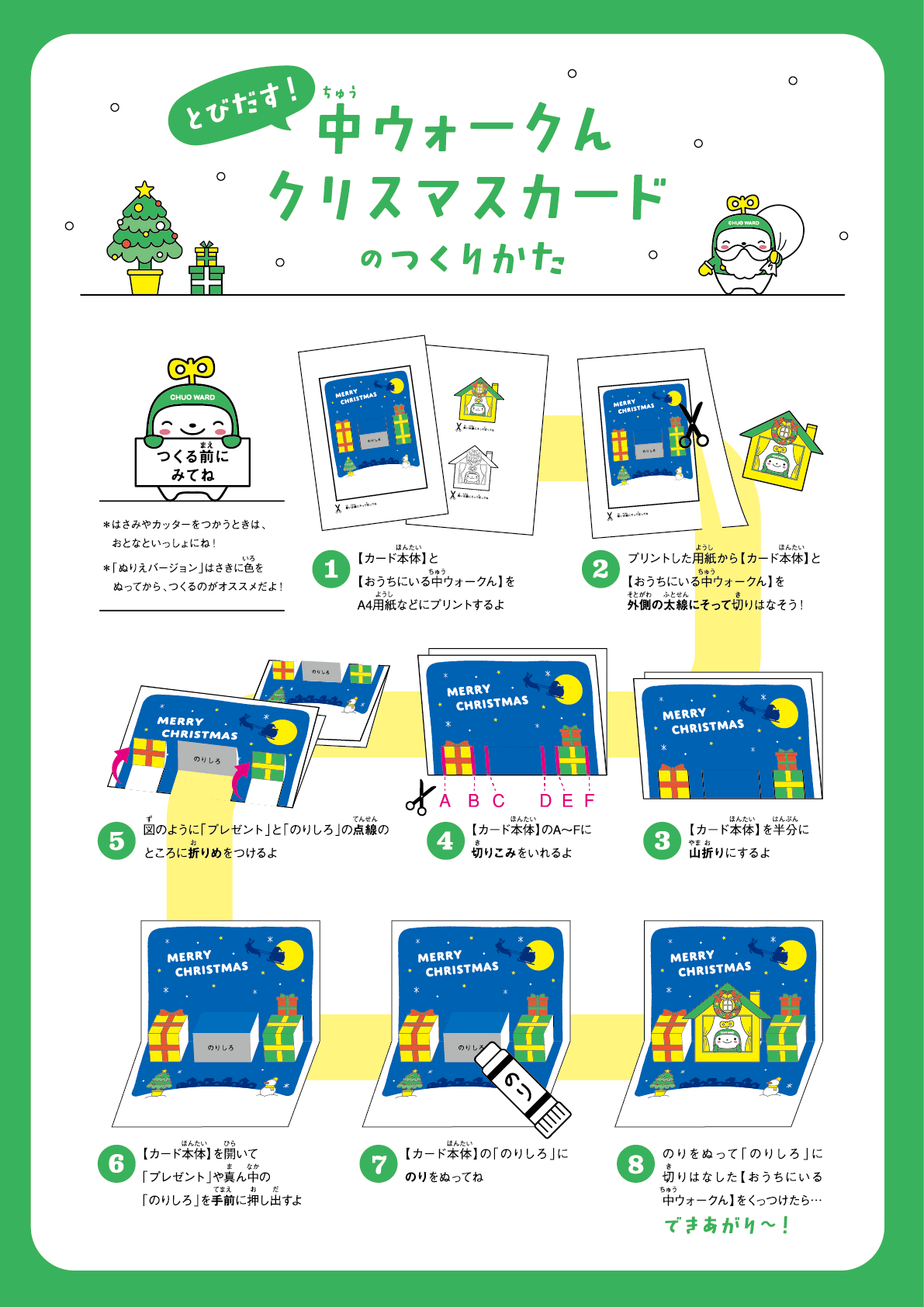 ・「中央区マスコットキャラクター「中ウォークん」に関する取扱要領」を熟読し、内容に同意の上、使用してください。また、使用にあたっては、「中央区マスコットキャラクター「中ウォークん」着ぐるみ取扱説明書」を必ずお読みください。