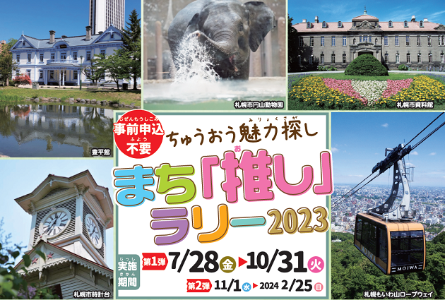 ちゅうおう魅力探しまち『推し』ラリー2023第一弾が始まりました!(終了しました) 区内5つのスポット(札幌市資料館、札幌市時計台、札幌市円山動物園、札幌もいわ山ロープウェイ、豊平館)を巡って各施設に設置しているポスターのキーワードを集めながら、地域の魅力を体感するイベントが始まったよ。抽選で50名の方に賞品をプレゼント! 賞品の中には、40名の方に当たる「中ウォークん」オリジナルグッズ(非売品)もあるので、どんどん参加してね! |