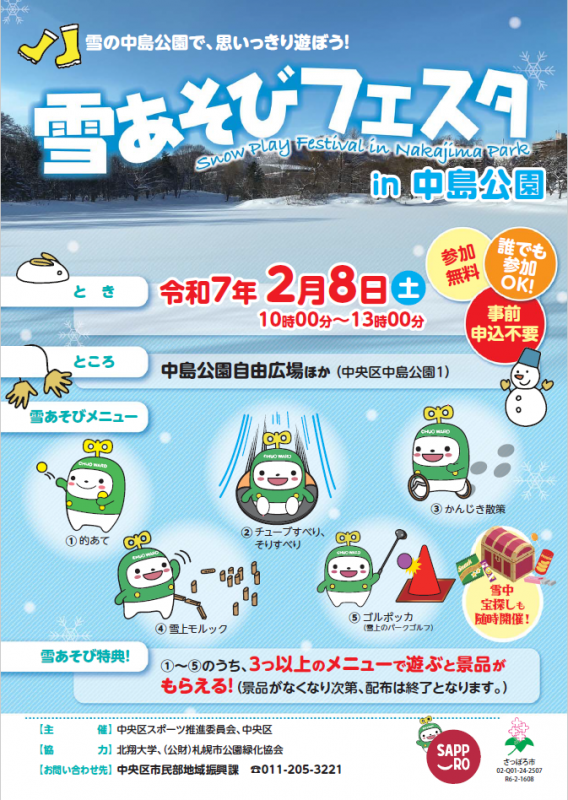 中央区スポーツ推進委員や北翔大学のスタッフと一緒に色々な雪遊びを体験して、冬の札幌の自然を満喫しましょう!