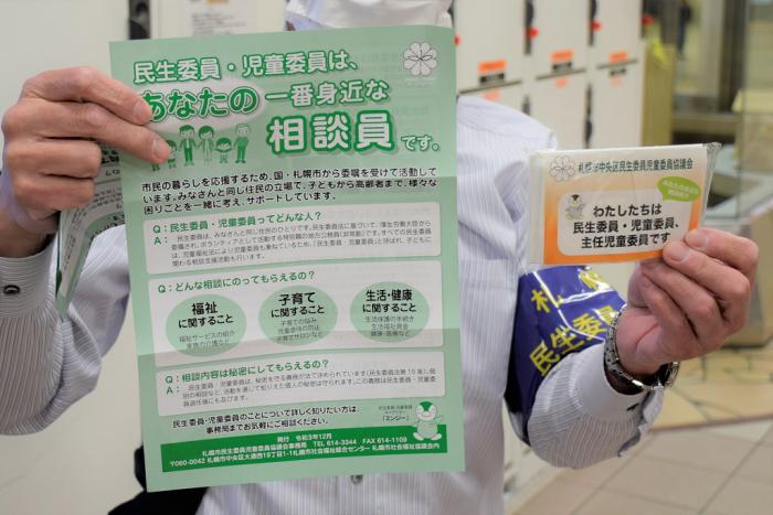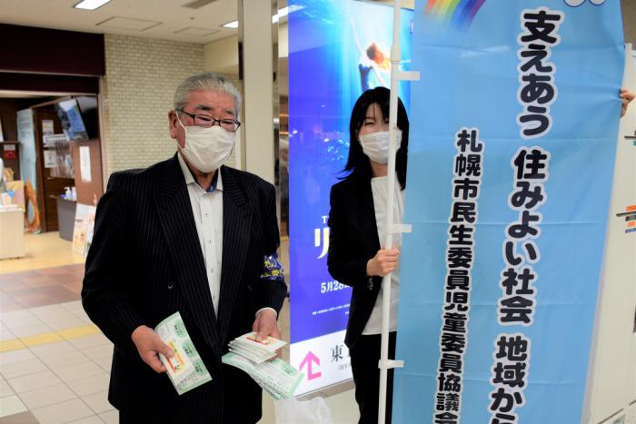 この日、参加者は、大通西4丁目交差点、中央区役所仮庁舎前、大通地下街「小鳥の広場」の3カ所に分かれ、道行く人々に笑顔で「民生委員の活動にご協力ください」などと声を掛けながら、「民生委員・児童委員は、あなたの一番身近な相談員です」と書かれたリーフレットとポケットティッシュなどの啓発品500セットを配布し、啓発活動を行いました。