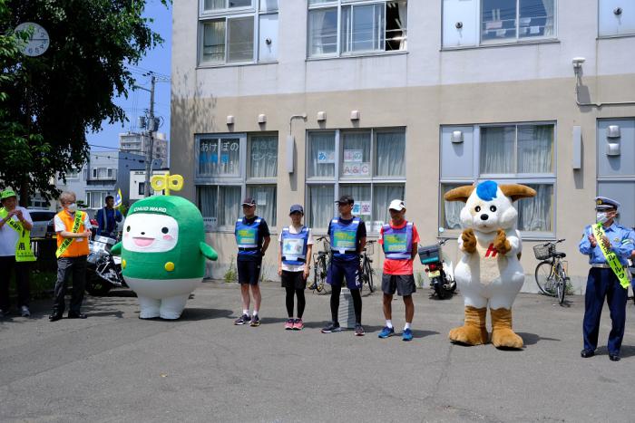 当日は、旗の波運動に加えて、各地区の住民が交通安全への願いを書き込んだ星形のメッセージカードを、七夕をイメージしたボードに装飾するため、南区の常盤中学校(南区常盤2-2)をスタートした同署の警察官が、各啓発場所を巡ってカードを受け取りながら、自転車とランニングによりゴールとなるあけぼのアート&コミュニティセンター(南11西9)を目指しました。