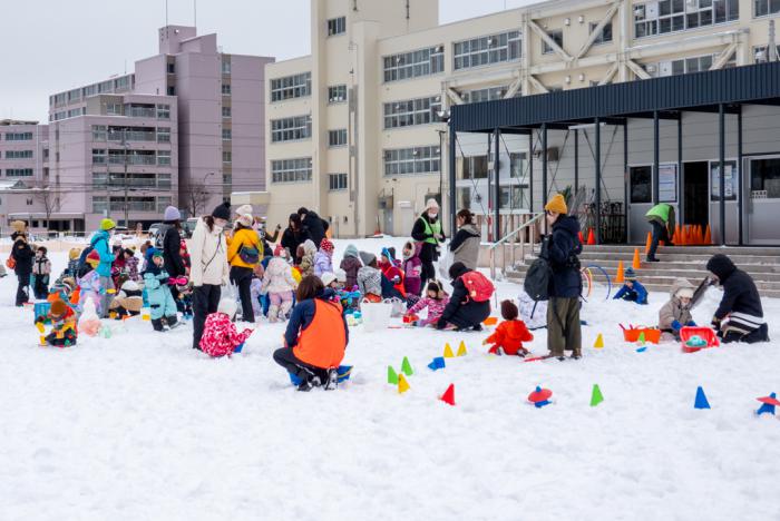 1月10日(金曜日)午前10時から、札幌市立向陵中学校(中央区北4条西28丁目)で「子育てスノーフェスタ」が開催され、赤ちゃんから小学生までの子どもとその保護者、ボランティアの小中高生・専門学校生など、約500人が雪遊びや室内遊び(ミニ子育てサロンなど)を一緒に楽しんだ。