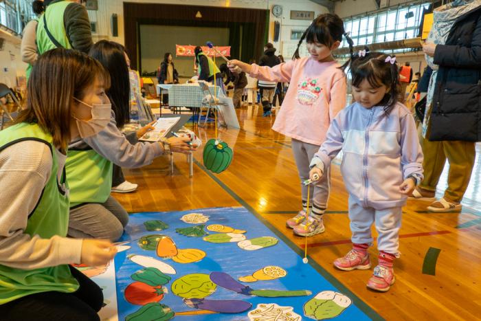 また、体育館内の「あそびのコーナー」にも子どもたちが列を作り、輪投げ、ゴルフ、おみくじ、ボーリングなどを楽しんだ。中央保健センター栄養士による「野菜釣り」コーナーでは、子どもたちは自分で釣り上げた野菜のイラストカードを手に「この野菜の名前はわかるかな?」と問いかけられて「かぼちゃ」「れんこん」などと元気よく答えていた。会場には、中央区マスコットキャラクター「中ウォークん」も登場し、子どもたちに囲まれ大人気だった。