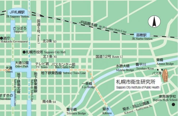 地下鉄「菊水駅」3番出口を出て、左側の最初の信号を左折してください。まっすぐ進み、菊水9条2丁目(5番目)の信号を左折し、つきあたりを右折すると、左側が衛生研究所です。