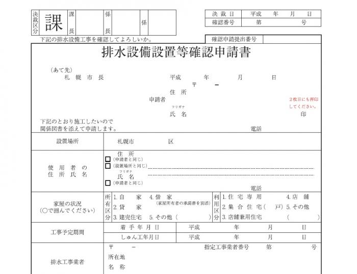 排水設備を設置または改築し公共下水道を利用する時は、あらかじめ市長に「排水設備設置等確認申請書」を提出し、確認を受けなければなりません。[札幌市下水道条例第8条で定めています] <提出先> 電話:011-818-3422 |