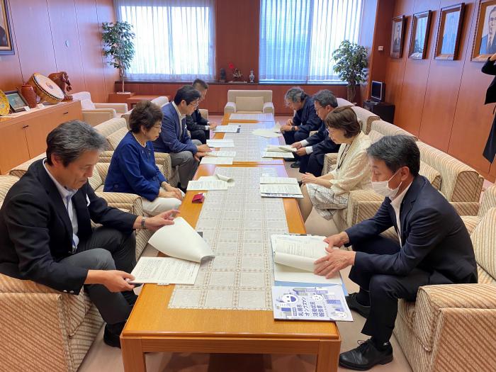 飯島議長としのだ副議長は、田村智幸代表オンブズマン、神谷奈保子オンブズマン、原俊彦オンブズマンから、オンブズマンの改善要望により市政が改善された例やオンブズマンの発意による調査結果の説明を受け、意見交換を行いました。