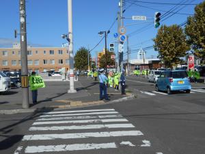 9月19日(金曜日)、秋の交通安全運動の一環として、ツルハドラッグ伏古店前の交差点で街頭啓発活動を行いました。当日は心地よい秋晴れとなり、地域住民や関係機関から約60名が参加しました。
