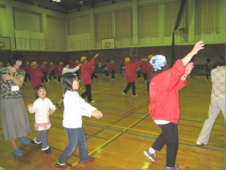 体育館で行われた東区音頭は78名が参加し、東区のマスコットキャラクターのタッピーと一緒に楽しみました。