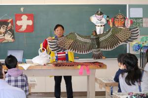 「たこづくり」では、田中光夫さんの指導の下、たこのデザインとなる絵をそれぞれ紙に描き、オリジナルのたこを作り、実際に空に飛ばしてみました。自分の思いと平和の願いを込めて、たこあげを楽しみました。