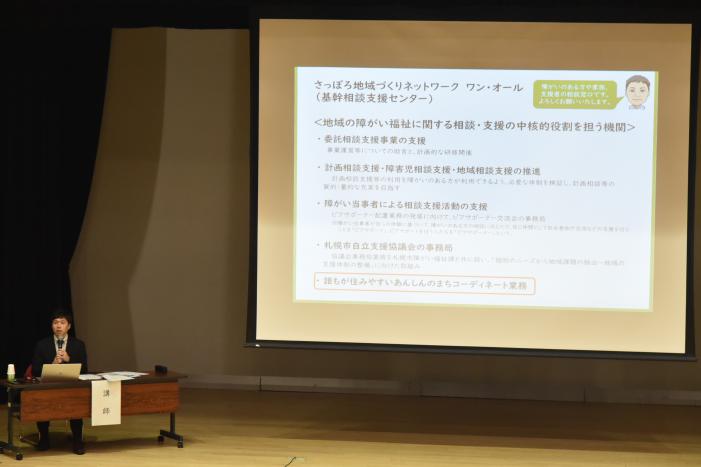 この日は年に一度の東区全体研修会で、地域の障がい福祉に関する相談・支援機関「さっぽろ地域づくりネットワーク ワン・オール」の相談支援専門員である髙村亮太(たかむら・りょうた)氏を講師に迎え、防災意識を持って地域と交流を育む大切さを学びました。