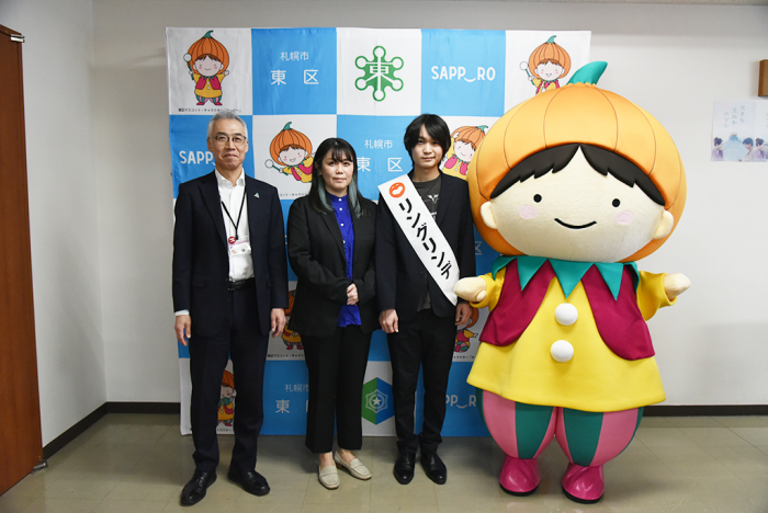 4月24日、株式会社よしもとセールスプロモーション&エリアアクション札幌支社の三上公一(みかみ・こういち)支社長と先月、東区PR担当芸人に就任した札幌よしもと所属芸人「リングリンデ」が、神賢寿(じん・まさとし)東区長を訪問しました。
