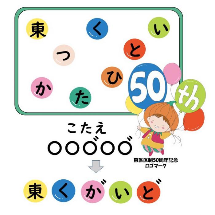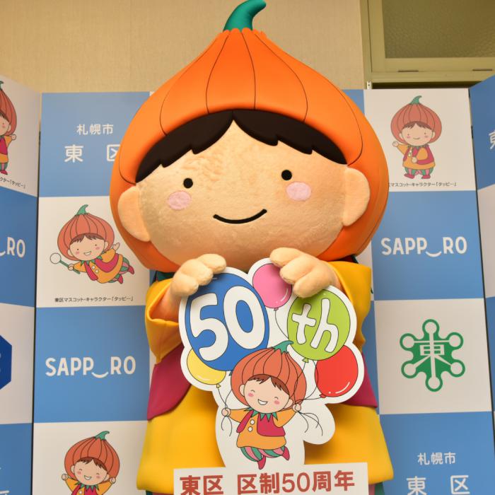 今年、東区は50周年!区民センターの1階ロビーにSNS映えばっちりな記念フォトパネルを置いたから、みんな見に来てくれると嬉しいな♪