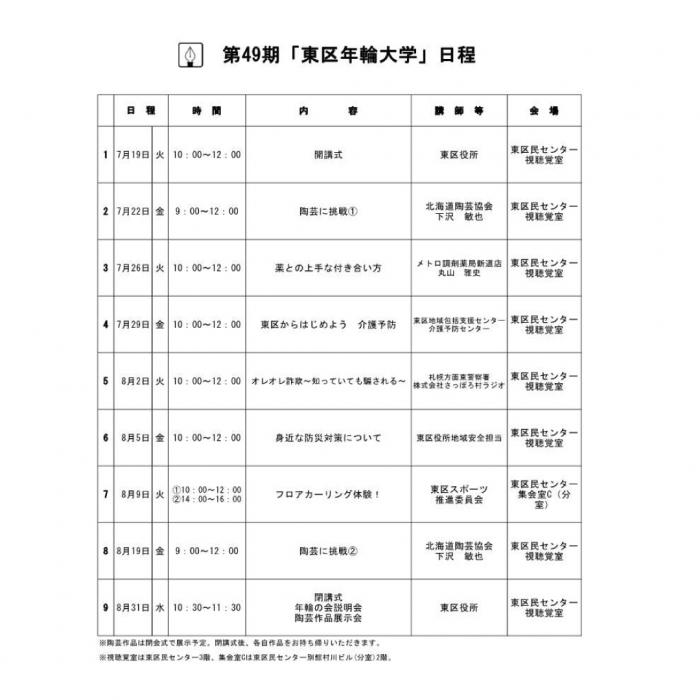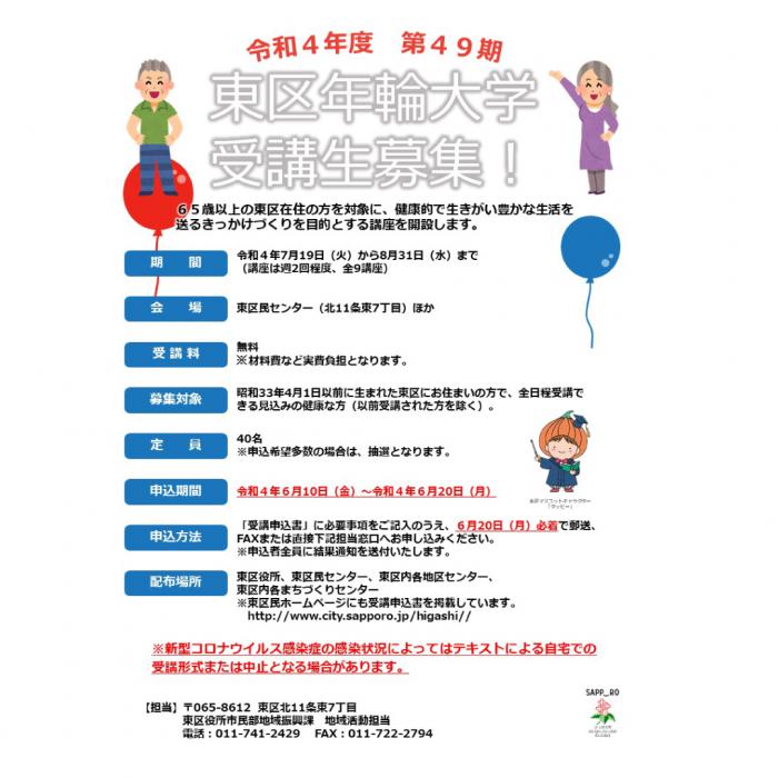 東区の65歳以上が対象の、「東区年輪大学」の受付が6月10日からはじまるよ~!陶芸やカーリング体験もあったりして、とっても楽しそうだよ、ふふふ♪申込期間は6月20日までだよ~!もし興味があったら、詳しいことが書いてある画像を見てね♪