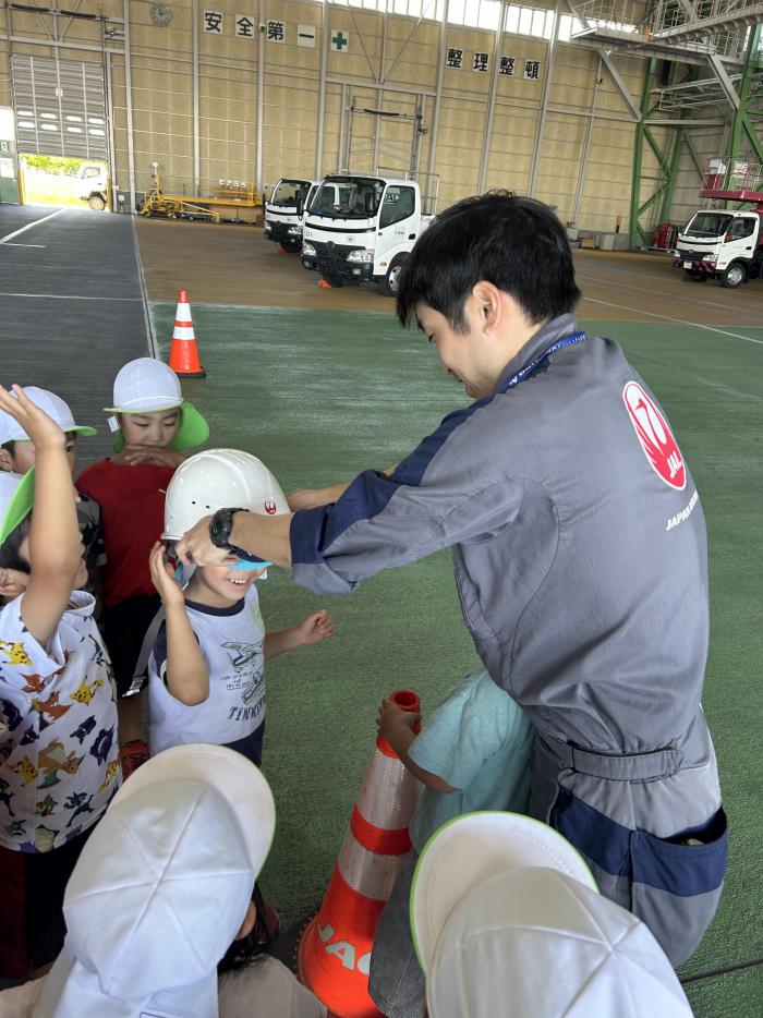 この日、子どもたちは2班に分かれて格納庫と空港ビルを見学。格納庫には整備中の飛行機が駐機していて、子どもたちは整備員の話に熱心に耳を傾けていました。