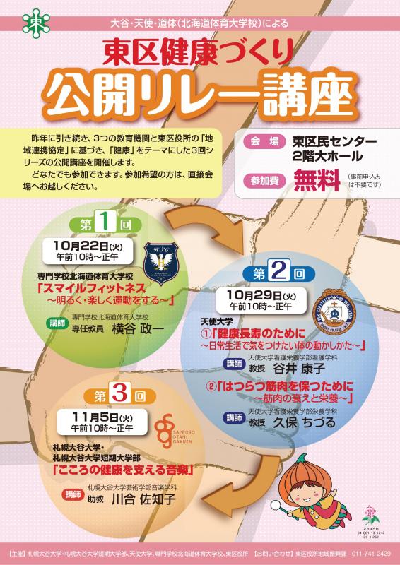 この講座は平成24年3月、区内の教育機関と東区役所が連携することで、それぞれの教育機関が持つ専門知識や学生の若い力を地域のまちづくりの活性化に生かしていこうと、札幌大谷大学・札幌大谷大学短期大学部、天使大学、専門学校北海道体育大学校と東区が協定を結んだことを機に開催され昨年に引き続き2回目。各教育機関が「健康」をテーマに「リレー」形式で隔週講座を開催した。