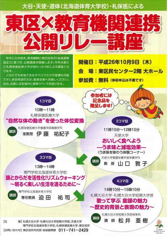 この講座は平成24年3月、区内の教育機関と区役所が連携することで、それぞれの教育機関が持つ専門知識や学生の若い力を地域のまちづくりの活性化に生かしていこうと、札幌大谷大学・札幌大谷大学短期大学部、天使大学、専門学校北海道体育大学校と東区が協定を結んだことを機に開催され、昨年度に引き続き3回目。今年度は、新たに札幌保健医療大学も加わり、協定を結んだ各教育機関が専門性を活かしたテーマを掲げて講座を「リレー」し、計4回の講座が開催された。