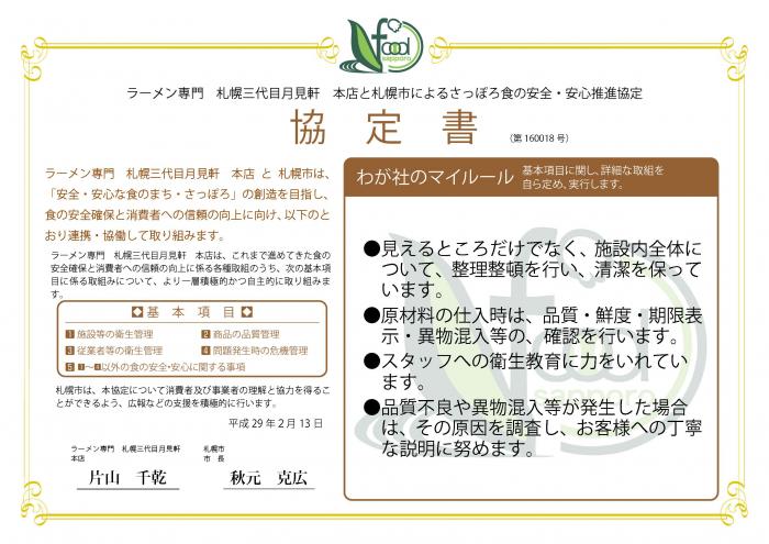 札幌市と「さっぽろ食の安全・安心推進協定」を締結した「ラーメン専門 札幌三代目月見軒 本店」の「マイルール」(食の安全・安心のために特に重点的に取り組んでいく事項)をご紹介します。