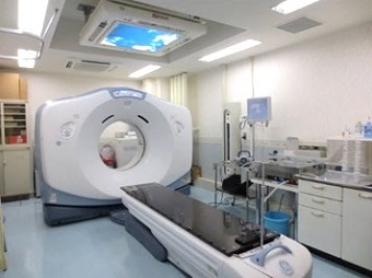 治療計画のためのCT撮影を行います。通常のCTとは異なり、寝台が実際の治療装置と同様の硬く平らな寝台を使用しており、固定具などの作成もここで行います。