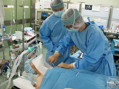 当科の手術は、原発性肺癌、転移性肺癌、縦隔腫瘍、重症筋無力症の胸腺摘出、膿胸、気胸、胸部外傷など多彩です。研修医の方にも手術操作に積極的に参加してもらっています。また、各手術時に鎖骨下静脈にCVラインを挿入しており、数百例を経験している指導医のもとで3カ月間に20例以上の症例を経験できます。自分でこの手技ができるようになることは、内科等にいっても大きな力になります。エコー下穿刺、従来のブラインド穿刺の両方の操作を覚えられることも当科の特徴です。
