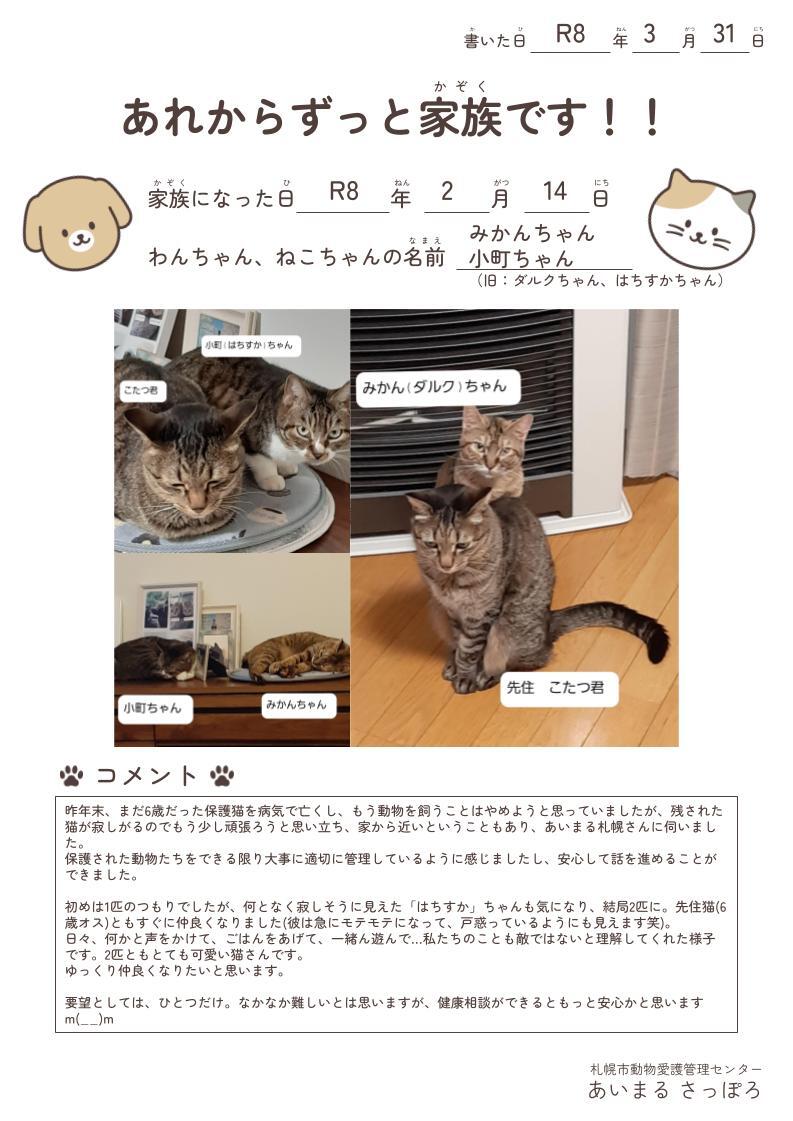 札幌市動物愛護管理センターから譲渡された動物たちの、その後についてお知らせいただいたお便りを、一部紹介しています。