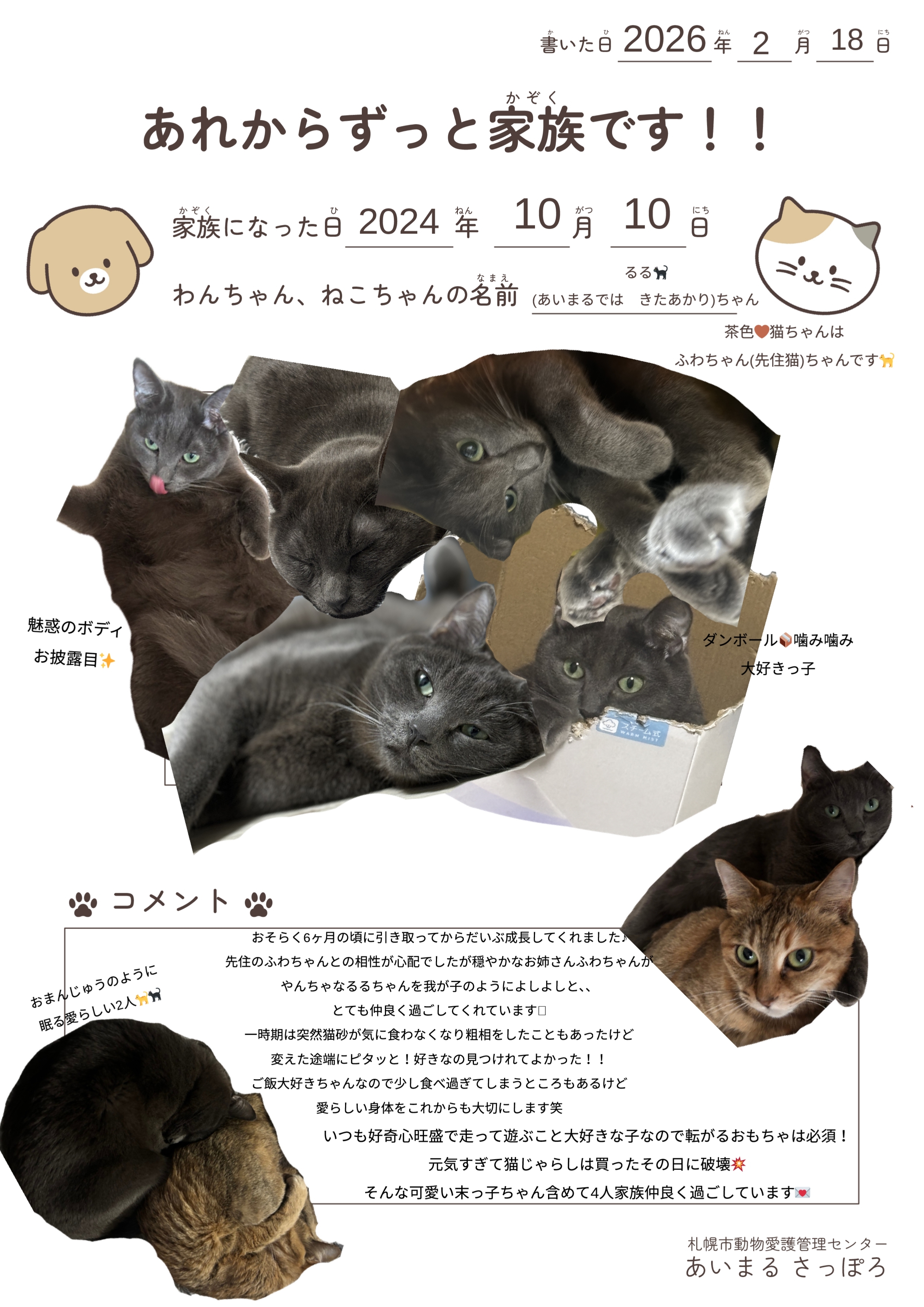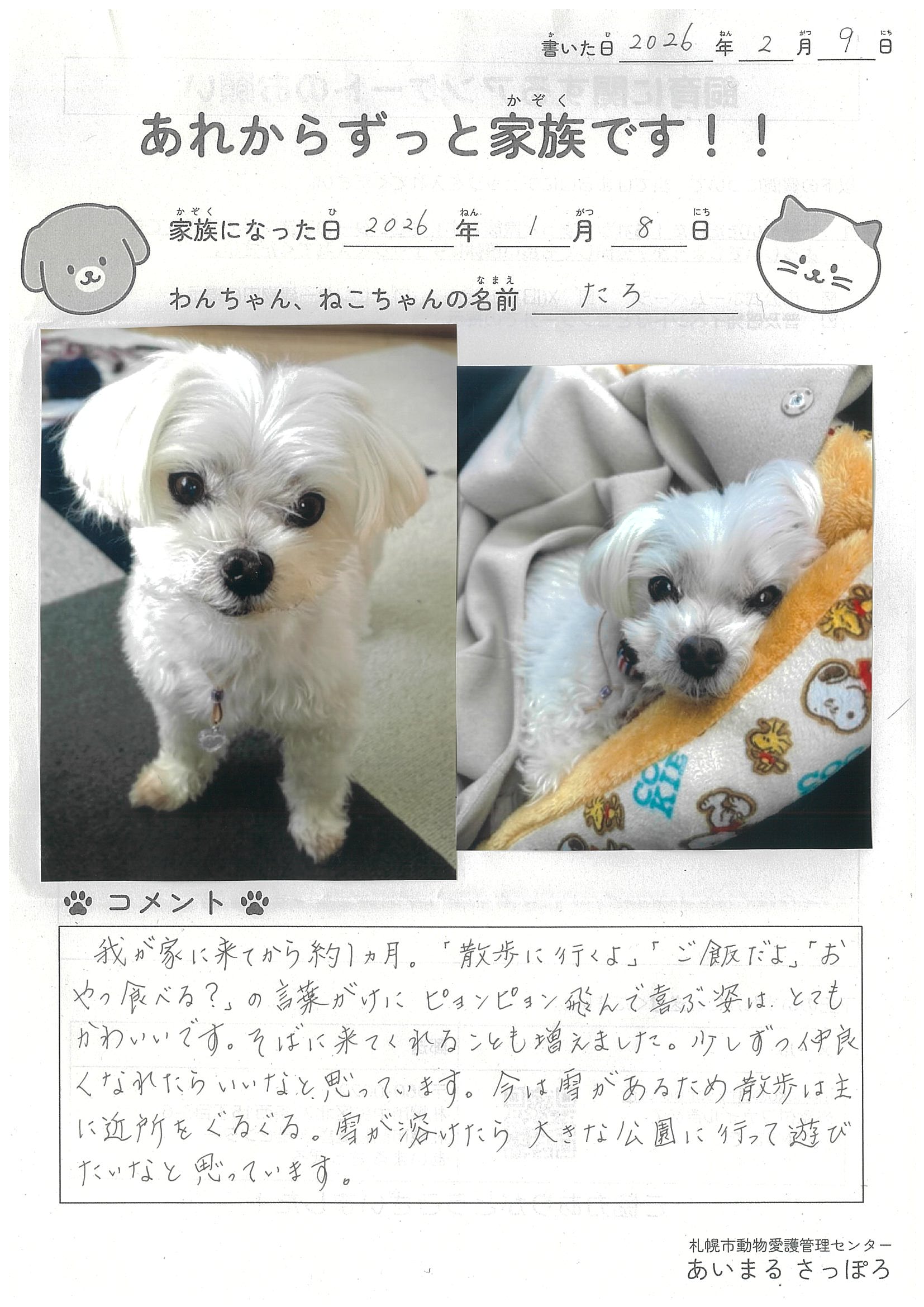 ホーム > くらし・手続き > 動物・ペット > 動物愛護管理センター(あいまる さっぽろ) > あいまる さっぽろからの譲渡 > あれからずっと家族です