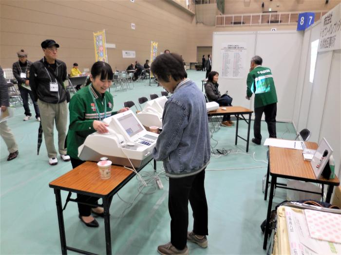 | 会場の様子(北海きたえーる会場) | 会場でレジ打ち体験をする来場者 | 企業ブースの様子 |