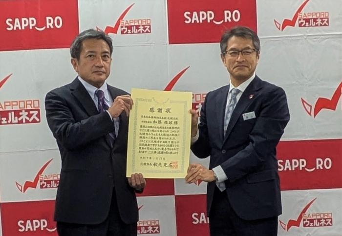 令和7年8月19日(火曜日)、札幌市民のウェルネス推進を目的としたご寄付をいただいたアサヒ飲料株式会社(米女 太一 代表取締役社長)に対し、山本副市長から感謝状を贈呈いたしました。