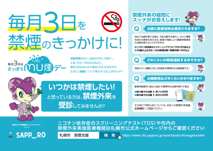 札幌市路面電車内に、毎月1日~5日の期間「さっぽろMU煙デー」に関するポスターを掲出しました。