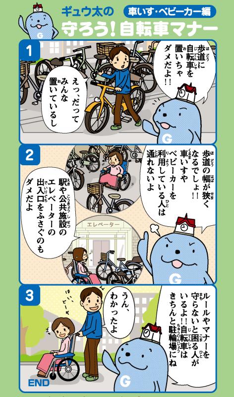 自転車を駐輪場以外の場所に放置することによって点字ブロックをふさぐ、車イス・ベビーカーの通行の支障となる、景観を阻害する、災害時や緊急時の救急活動の妨げになる等、様々な問題が生じ、困る人が出てきます。