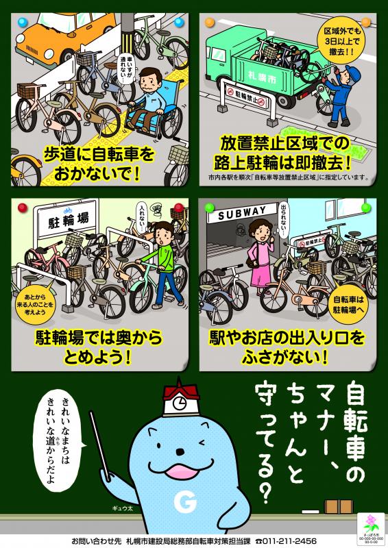 札幌市では、自転車や原動機付自転車が多く放置されている現状を受け、自転車の駐輪マナーをより広く理解していただくためにイラストを作成しました。