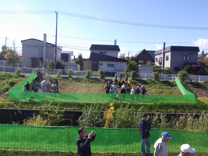サクラ(ヤエザクラ、エゾヤマザクラ)の植樹と、維持管理の際、安全に河川敷に降りられるよう階段と手摺りを取りつけました。