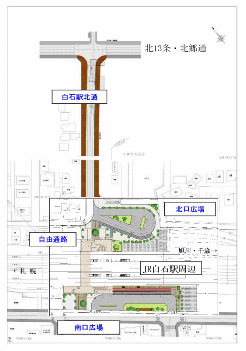 JR白石駅周辺地区整備事業では、これらの課題を整理するため、南北駅前広場や自由通路等の整備を実施し、バスへの乗継利便性の向上や快適な歩行空間の確保を図り、交通結節点として、人との交流拠点として整備を進めます。