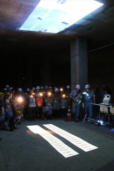 子ども達は専用の黄色いヘルメットを被り、探検ボードを使って各現場でミニレポートを作成しながら、都心部で工事中の地下歩道や地下鉄・トンネルの裏側、大規模な水道工事の現場を見学しました。