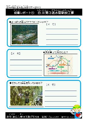 子供たちは専用の黄色いヘルメットを被り、浄水場の大規模な送水管トンネルや、大倉山のジャンプ競技場改修工事を見学し、各現場担当者からの説明をしっかり聞きながら、現場レポートの作成にも取り組みました。