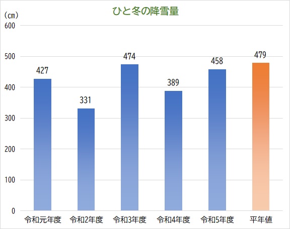 例えば(たとえば)、令和3年度(2021年度)に札幌にふった雪がとけないで積もった(つもった)とすると、その高さは4m74cmにもなるんだ。でも、令和2年度(2020年度)は3m31cmだったんだよ。札幌の降雪量(こうせつりょう)を平均(へいきん)すると4m79cmになるんだって。