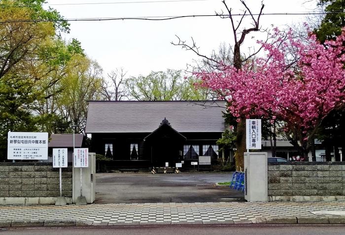 樹名板を設置した新琴似神社・新琴似屯田兵中隊本部前の八重桜(サトザクラ関山)は見ごろを迎えていますが、新型コロナウイルス感染症まん延防止等重点措置に伴い市有施設は原則休館しており、札幌市指定有形文化財「新琴似屯田兵中隊本部」も5月31日まで閉館期間を延長しています。