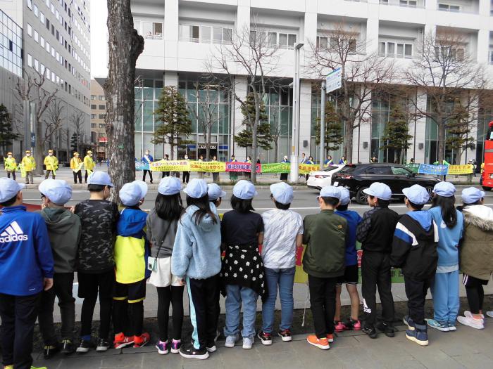 この日の気温17度と、久しぶりに春らしく暖かなお天気に恵まれ、交通安全運動にはぴったりの一日となりました。参加した皆さんは、交通事故防止の願いを込めて小旗や幟を掲げ、啓発活動を行いました。また、今回は北九条小学校4年生の皆さんが、沿道で横断幕を掲げ、走行するドライバーや歩行者に元気いっぱいに交通安全を呼びかけました。
