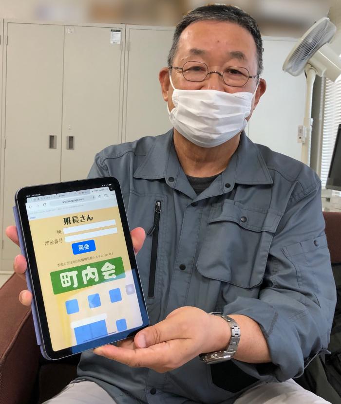 現在はコロナ下で一部の取り組みに限定して開催していますが、団地の住民の半数以上が高齢者とのことで、今、最も力を入れているのがタブレットを活用した高齢者等の見守り体制の確立です。高齢者等の見守りデータベースは以前から整備していましたが、これをタブレットで閲覧しやすくするための専用システムを新たに制作しました。理事長の磯野さんは「これはセキュリティ対策を徹底したもので、4人の役員がどこにいても緊急事態の際に安全に情報を共有できるようになりました」と話します。