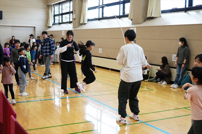 この日は、同協会が主催するヨガやダブルダッチなどの無料教室体験のほか、消防や自衛隊、アナウンサーの職業体験、スポーツウェア試着などが行われました。次々と指示される色の輪に跳ぶ「アクションジャンプ」を体験した子は「初めてで少し難しかったけど楽しかった」と話しました。