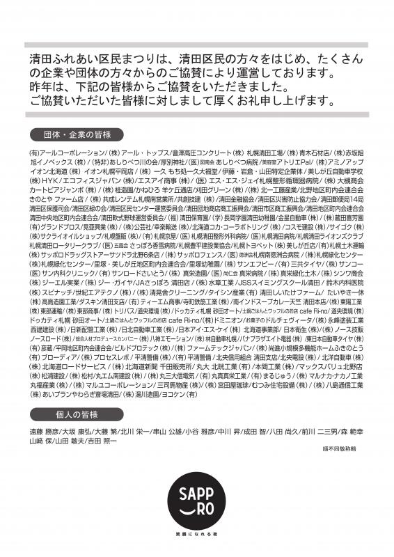 清田ふれあい区民まつりは、清田区民の方々をはじめ、たくさんの企業や団体の方々からのご協賛により運営しております。