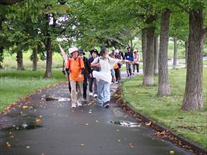 この日歩いたのは、清田区役所を出発し、厚別川の堤防等を歩く約5kmの「厚別川橋めぐり水辺コース」です。出発前は小雨模様でしたが、ウオーキングの最中は雨にも降られず、参加者は「頭の活性化のため、ウオーキングを日課にしているので開催できて良かった」「あまり歩いたことのない道で新たな発見ができた」など話しながら、約2時間のウオーキングを楽しみました。