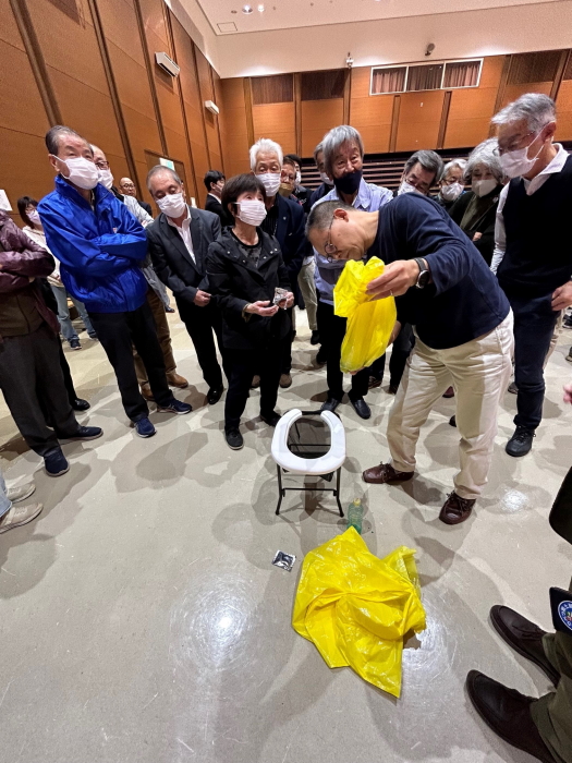 さらに、テントパーテーションを補完するダンボールを活用したパーテーションづくり、断水時の簡易トイレの組立を実際に体験しました。