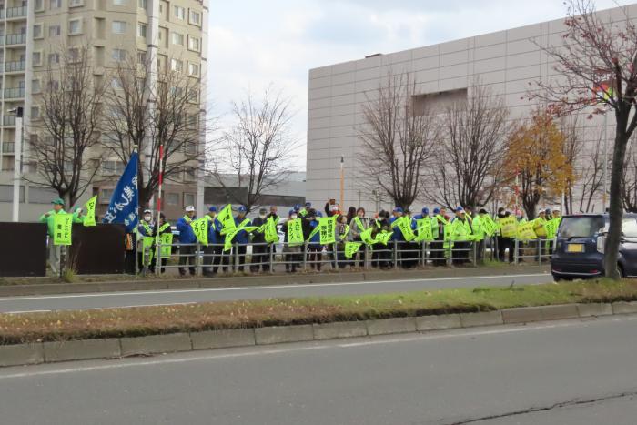 冬の交通安全市民総ぐるみ運動に合わせて11月13日(木曜日)、清田区交通安全運動推進委員会の主催で、交通事故防止集会が区役所前市民交流広場にて開かれました。