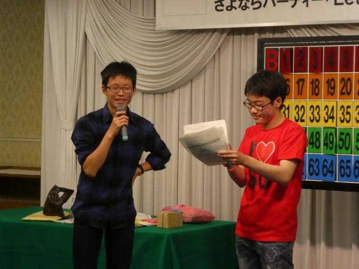 札幌での最後の夜には、シンガポール団員と札幌のホストファミリーが一堂に会し、夕食会を楽しみました。なお、この「さよならパーティー」は札幌団員が何度も集まって企画したもので、当日の司会・進行もすべて子どもたちが担当しました。 シンガポール団員は練習を重ねたダンスや歌を披露し、札幌団員はビンゴなどのアトラクションを催し、お互いに感謝の気持ちを伝え合っていました。 |