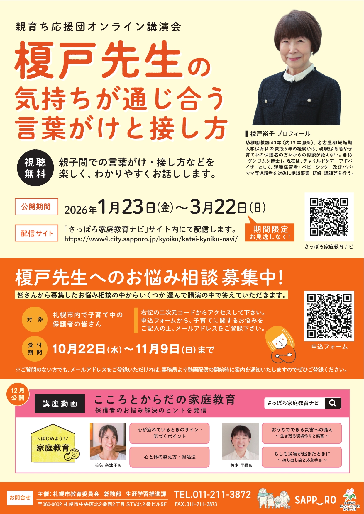 講演会動画は「さっぽろ家庭教育ナビ」にて期間限定配信しておりますので、ぜひご覧ください。