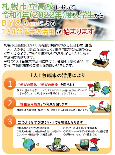 札幌市立高校において、学習指導要領の改訂に合わせ、生徒一人一人がICT(※2)を活用して、主体的に学びを深めることができるよう、令和4年(2022年)度からBYODによる1人1台端末の活用が始まります。
